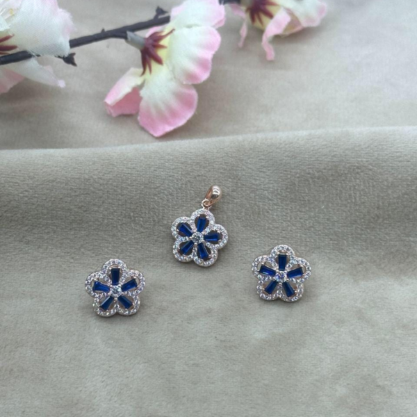 Discover the enchanting allure of the Azure Blossom Rose Gold Pendant & Earrings Set. This charming set, crafted from 92.5 silver and adorned with a delicate rose gold finish, features a floral design with a captivating blue gemstone. Weighing 7.490 grams, this elegant ensemble exudes a refined beauty, perfect for adding a touch of grace to any outfit.