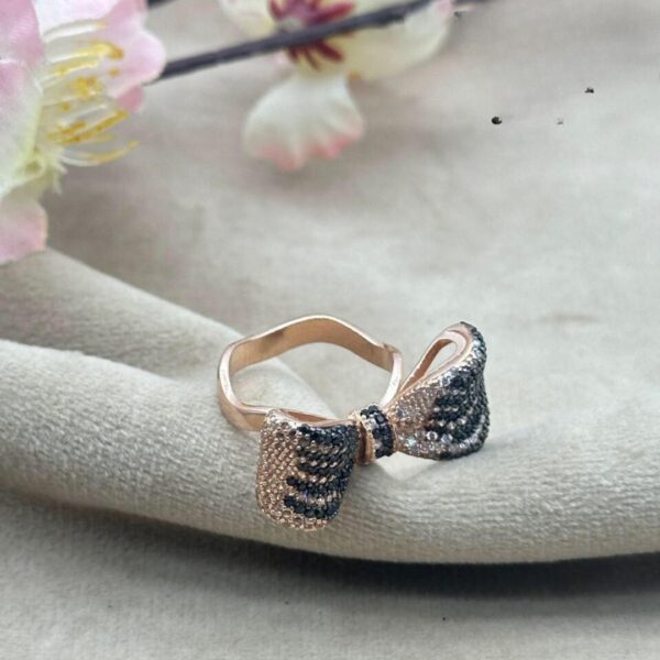Imagine the cool touch of the rose gold against your skin as you slip on this ring. The weight is comfortable at 7 grams, perfect for comfortable evening wear. The delicate bow and sparkling gemstone create a conversation starter, a symbol of love expressed with a touch of whimsy.