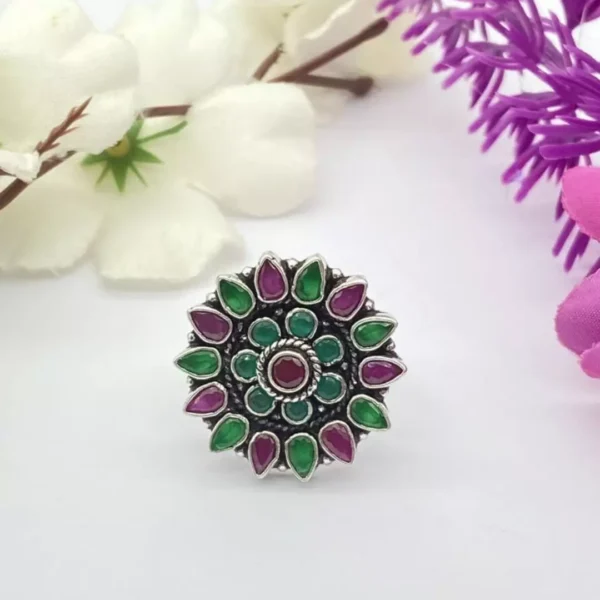 Celestial Bloom Ring: A harmonious blend of pink and green gemstones, capturing nature’s grace in a sterling silver design.
