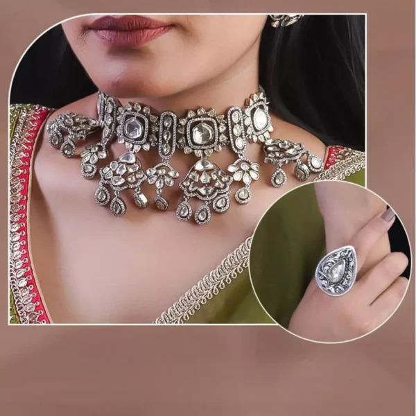 Crafted to enhance your natural grace, the Ethereal Harmony set features a beautifully designed necklace and matching finger ring in premium 92.5 silver. Each piece is a testament to fine craftsmanship, merging simplicity with elegance. The timeless design exudes a sophisticated charm, making this set ideal for any occasion where you want to feel poised and radiant. Let the purity of silver enhance your look, elevating your style with a touch of classic allure and elegance.