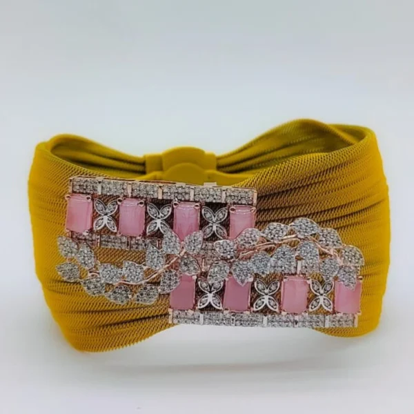 The Golden Blossom Cuff Bracelet exudes elegance with its harmonious blend of colors and refined design. Made from 92.5 silver, this bracelet showcases a warm yellow base complemented by a delicate soft pink gem top. The combination of these hues creates a sophisticated and radiant appearance, making it an ideal choice for those who appreciate a touch of floral-inspired grace in their accessories.