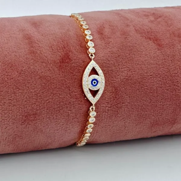 Embrace elegance and protection with the Guardian Glance bracelet, crafted in high-quality 92.5 silver. This exquisite chain features a captivating evil eye motif, delicately adorned with zirconia stones for a hint of sparkle. Designed to add a touch of mystique to your everyday look, this bracelet offers both a fashionable appeal and a timeless symbol of good fortune.