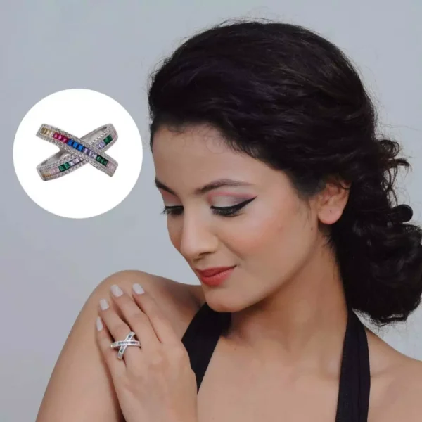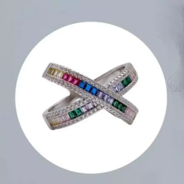 Design: Overlapping bands with rainbow-colored zirconia stones in premium quality