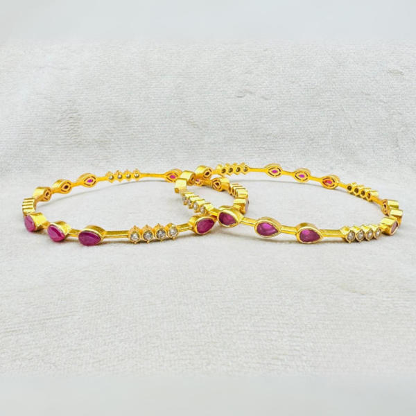 Add a soft, luxurious touch to your style with the Rosy Charm Sling Gem Bangles, crafted from 92.5 silver and finished with elegant gold plating. Featuring a vibrant pink gem, this piece brings a delicate blend of sophistication and grace to any outfit.