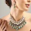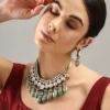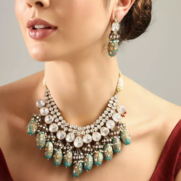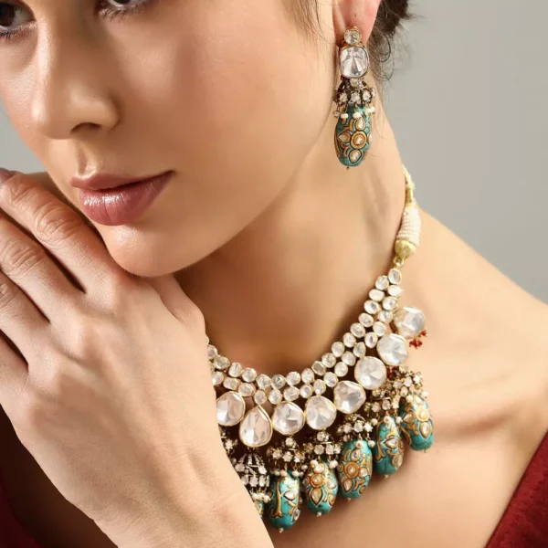 Experience the epitome of refined elegance with the Turquoise Majesty Neckpiece Set, a striking creation that exudes a blend of modern sophistication and classic allure. Crafted from 92.5 silver, this set is enhanced by a contemporary gold polish that radiates a luxurious glow, making it a standout piece in any jewelry collection. The neckpiece, designed with graceful lines and a flawless finish, is accentuated with the vibrant touch of turquoise elements, symbolizing serene beauty and unmatched opulence. Perfect for grand celebrations or elevating your everyday elegance, this set transforms any attire into a statement of style and grace. The meticulously crafted design and premium quality materials ensure a piece that is both timeless and distinctive, adding a touch of royalty to your collection.