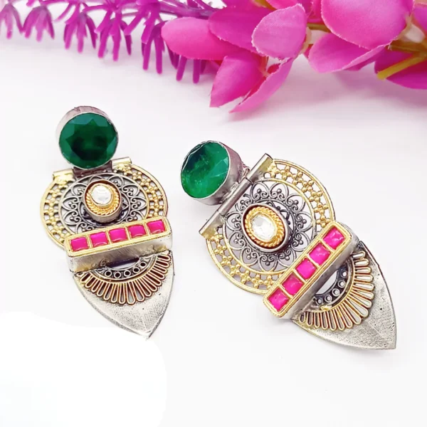 Elevate your look with the Verdant Grace Heavy Silver Earrings, intricately designed with a stunning green drop motif. Crafted from 92.5 silver and adorned with a luxurious junk jewellery finish, these earrings embody a perfect blend of vintage charm and modern sophistication. With their bold design and exceptional craftsmanship, they are ideal for special occasions or adding a touch of grandeur to your style.