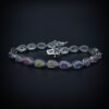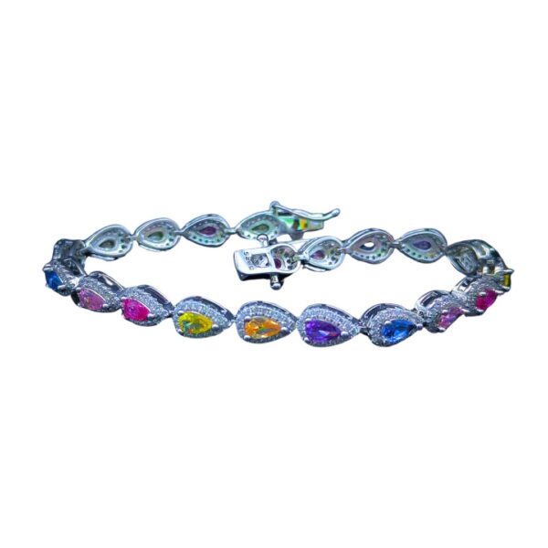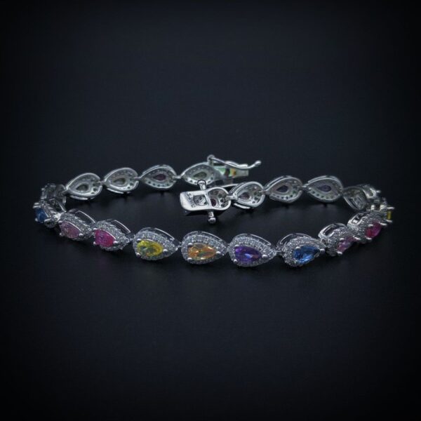 Embrace playful elegance with this Women’s Sterling Silver Bracelet featuring Rainbow Drops. Delicate sterling silver chains intertwine to create a captivating design, accented with vibrant gemstones that shimmer in every light.